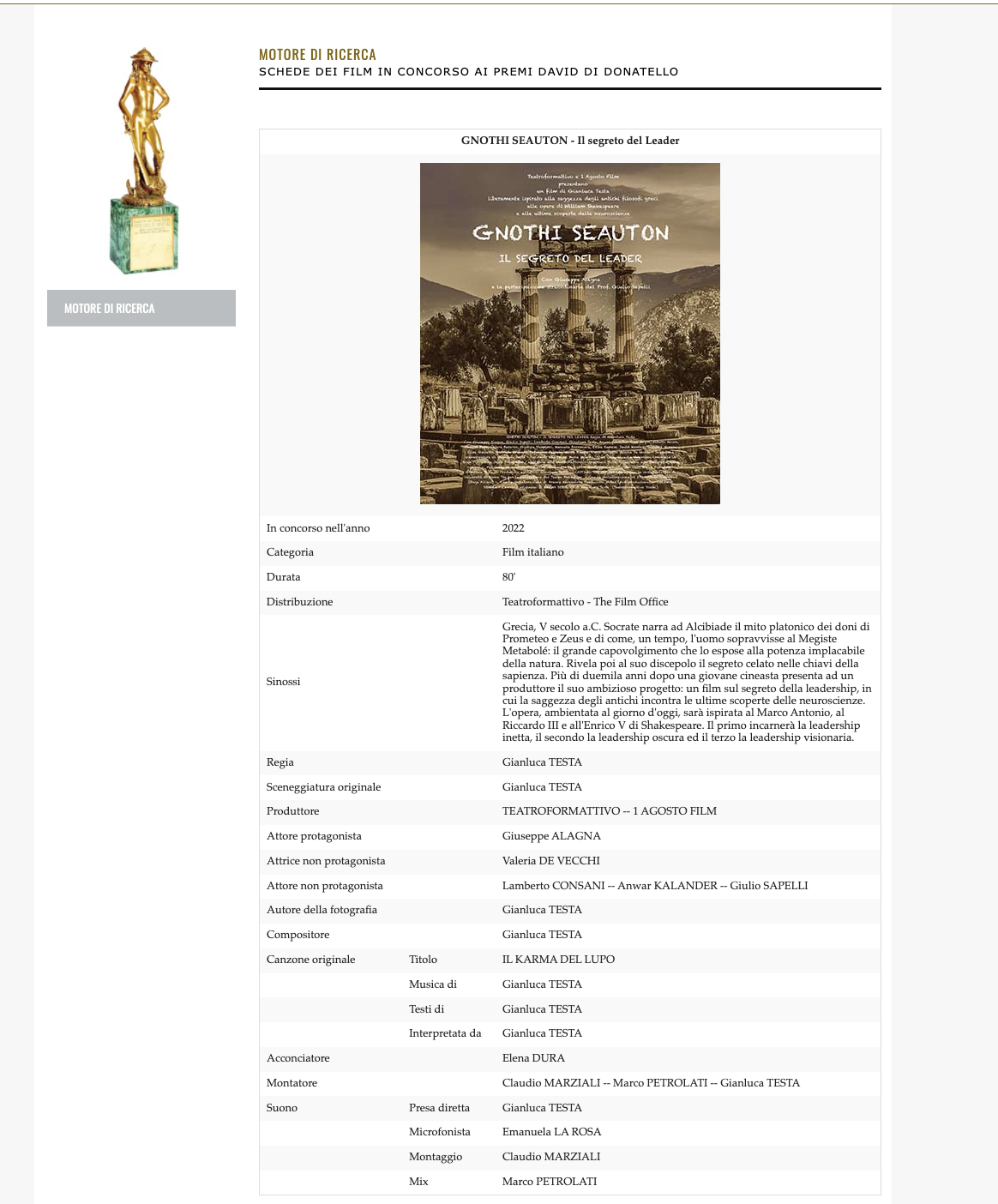 Caro Gianluca, il lungometraggio Gnothi Seauthon – Il segreto del Leader, prodotto da Teatroformattivo in collaborazione con 1 Agosto Film SRL e da te scritto e diretto, è un film sperimentale e coraggioso che, dopo una gestazione difficile, durata anni (il film è stato girato tra il 2015 ed il 2018), e la vittoria di ben 5 premi al Festival Di Grottammare nel 2019 (tra cui Miglior Film, Miglior Regia e Miglior Sceneggiatura) ha finalmente trovato distribuzione in Italia e all’estero nel 2021, grazie a Film Office Ltd, lungimirante società di distribuzione britannica, ed è ora ufficialmente in concorso per il Miglior Film Italiano ai David di Donatello 2022, dove sei in gara anche per il premio di Miglior Regista. Ti aspettavi questo risultato?